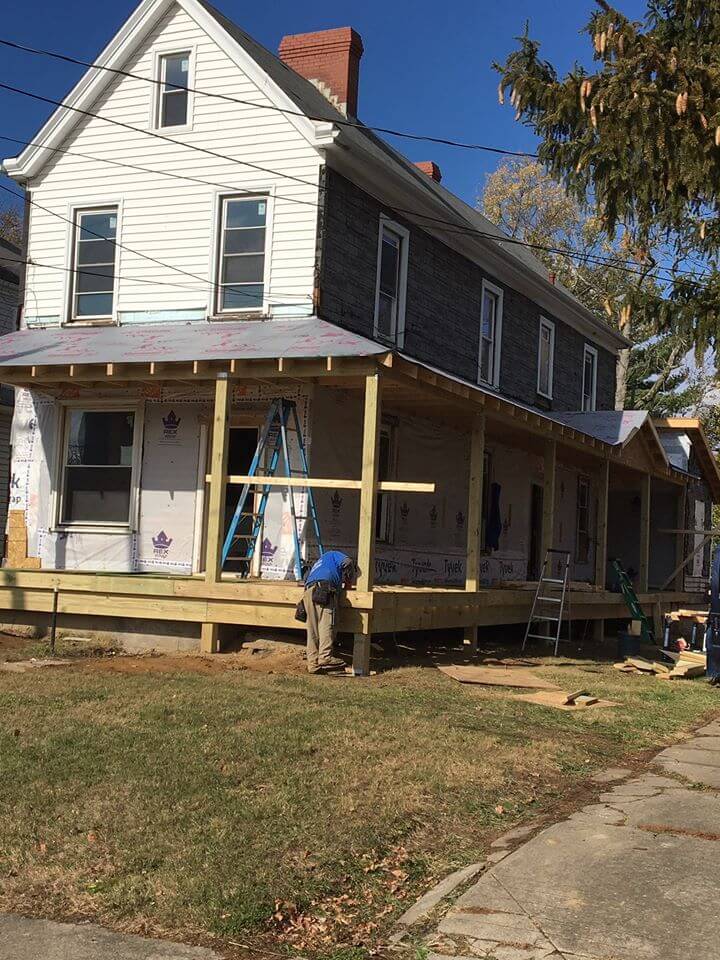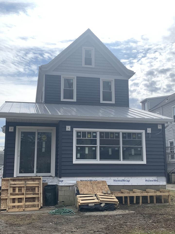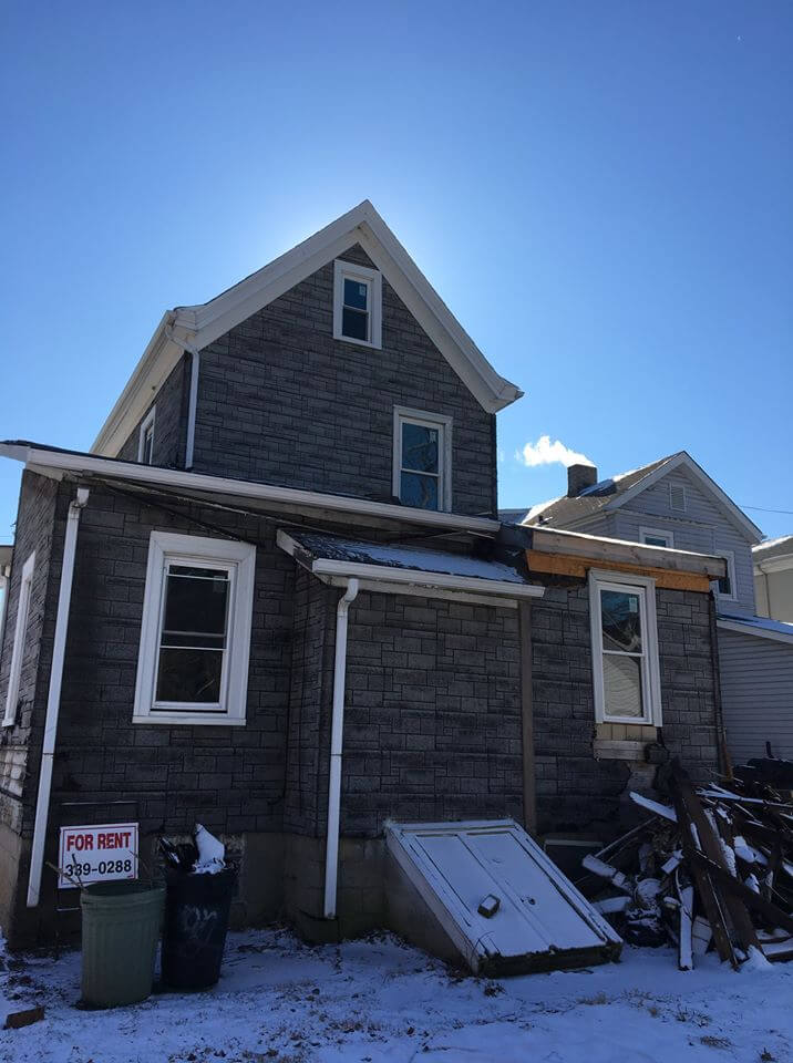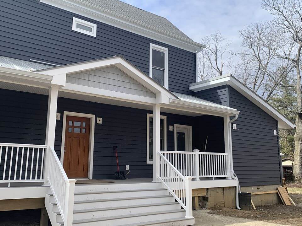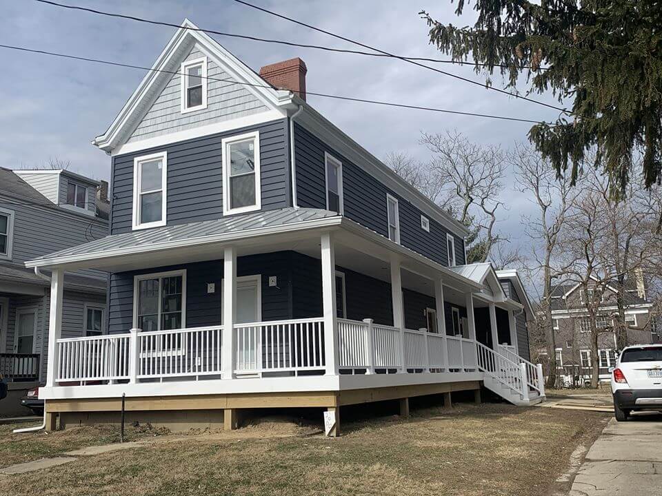 A full exterior transformation from neglected home to a modern farmhouse in Norwood . We installed Polaris Renovation foam back siding and vinyl cedar shake as an accent to the Blue Ridge color siding. All siding was manufactured by Polaris. “Kleer” PVC trim was used to case out all windows, trim, and soffit on porch. RDI composite Transform railing was used on the porch for a maintenance free long term railing option. Deckorators Tongue and Groove composite decking was used to continue the maintenance free theme. Metal roof Advantage Lock II manufactured by Union Corrugating was installed on this project. All products came from local Cincinnati distributor Modern Builders Supply.